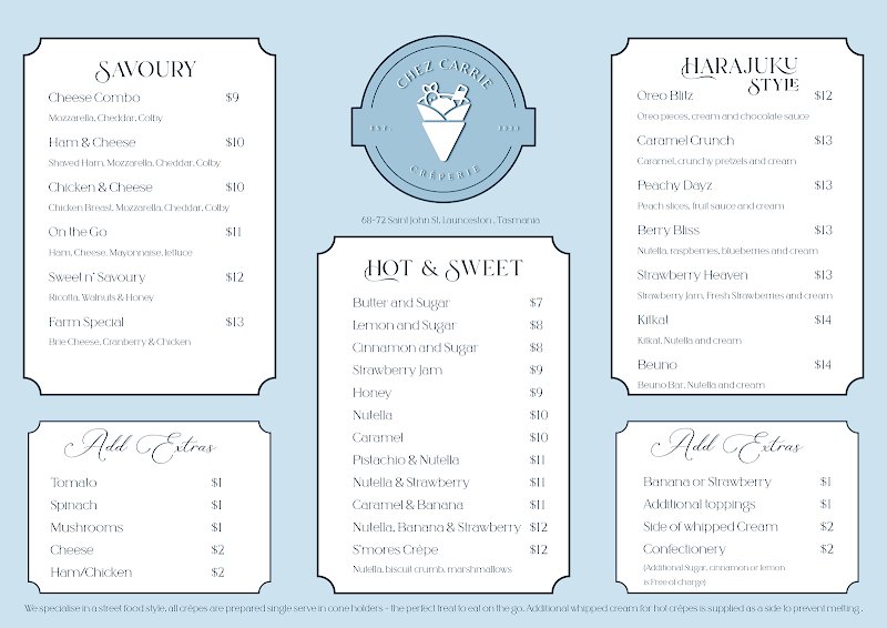 Welcome to Chez Carrie Crêperie, where the aroma of freshly baked crêpes and the sound of lively conversation create an irresistible French-inspired experience. Indulge in our delectable menu, showcasing traditional recipes and locally-sourced ingredients, all served in a cozy and charming atmosphere that transports you to the heart of Launceston, Tasmania.