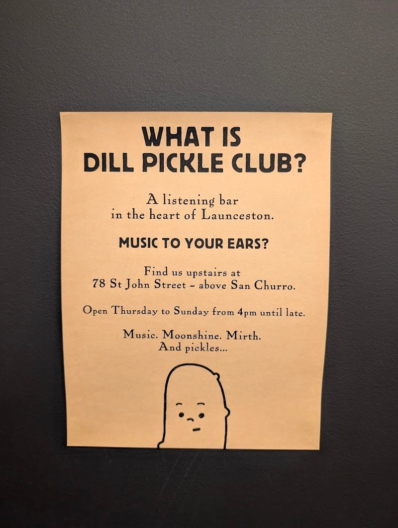 We found out about The Dill Pickle Club from an architectural review just before our trip to Launceston...what a gem! It is a cool, retro bar with some really clever design elements. The welcoming, friendly, knowledgeable folk serve great drinks. We didn't get a chance to try the food as we were on the way to dinner. The sound system and retro music (on vinyl) were excellent, and it looks like there will be a terrace/roof garden in the near future. We look forward to revisiting this hidden treasure, upstairs in the CBD, on our next trip to Launceston.