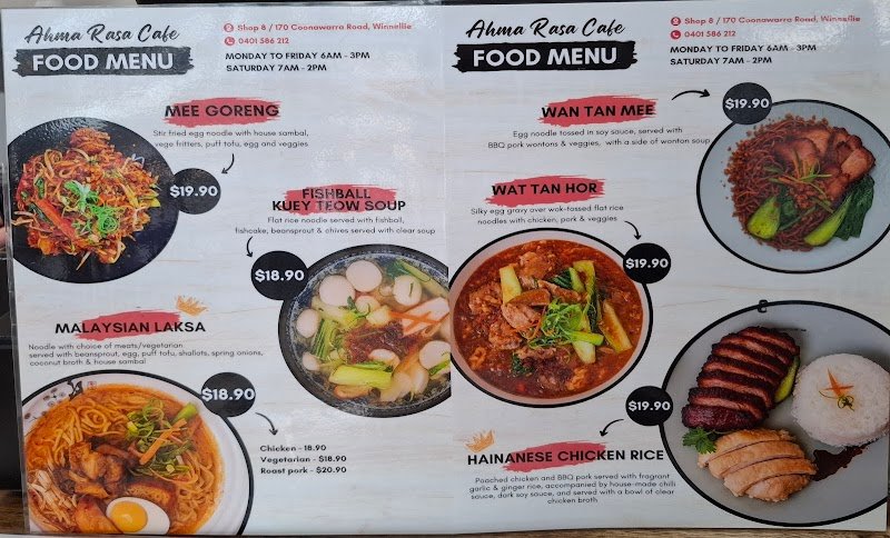My partner has a very punishing rating process and rarely gives a dish more than a 6 or 7, so I was shocked when he took one sip of the laksa broth at Ahma Rasa Cafe and declared it was a 9โฆno, a 9.5! This is a we-mean-business kind of family run operation. Lovely staff, clean restaurant area and exceptional food.