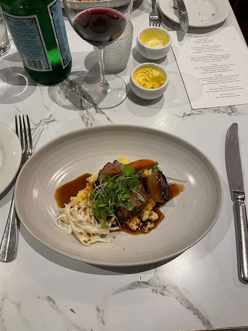 Yesterday we went to Boucher French Bistro! On average, we’d rate it around a 3.5. The food was generally good, but considering the prices and the fact that it’s a French specialty restaurant, we were expecting a bit more. For the entrée, we had the beetroot, horseradish and dill cured salmon with grilled polenta. The polenta was amazing : I loved it! The sauce around it, however, lacked flavour. Presentation-wise, though, it was excellent (as you can see 😄). For the main, I had the Angus beef, which I really enjoyed. Everything on the plate was delicious, yes, even though I had it well done, which many people would judge me for 😂. I’d give the flavour a 5, but I expected a bit more from the veggies on the plate considering the price. I also ordered the honey salad, which was good, nicely seasoned. My partner had the bouillabaisse and said he loved the sauce and really appreciated the dish overall, but the scallops and prawns were slightly overcooked, which brought the experience down a bit for us. We shared the Lindt chocolate soufflé for dessert, and that was a win! The ice cream came with some crumble at the bottom, and the melting chocolate on top was absolutely delicious. Definitely worth trying! Now, about the staff, we had read reviews beforehand, and there were quite a few complaints about service. But honestly, we had a great experience. Most of the staff seemed young, but they were supportive, attentive, quick with our orders, kept our drinks filled, and did their job really well. They’re not the super chatty, coffee-shop-style staff, but they were friendly and professional, totally fitting for the environment. So I don’t understand the low ratings on that. Parking was easy. The atmosphere was nice — a bit dark (but that seems to be a French restaurant thing? Haha no real complaints there). I was just in a slightly unstable chair 😅. Overall, it’s a nice spot!