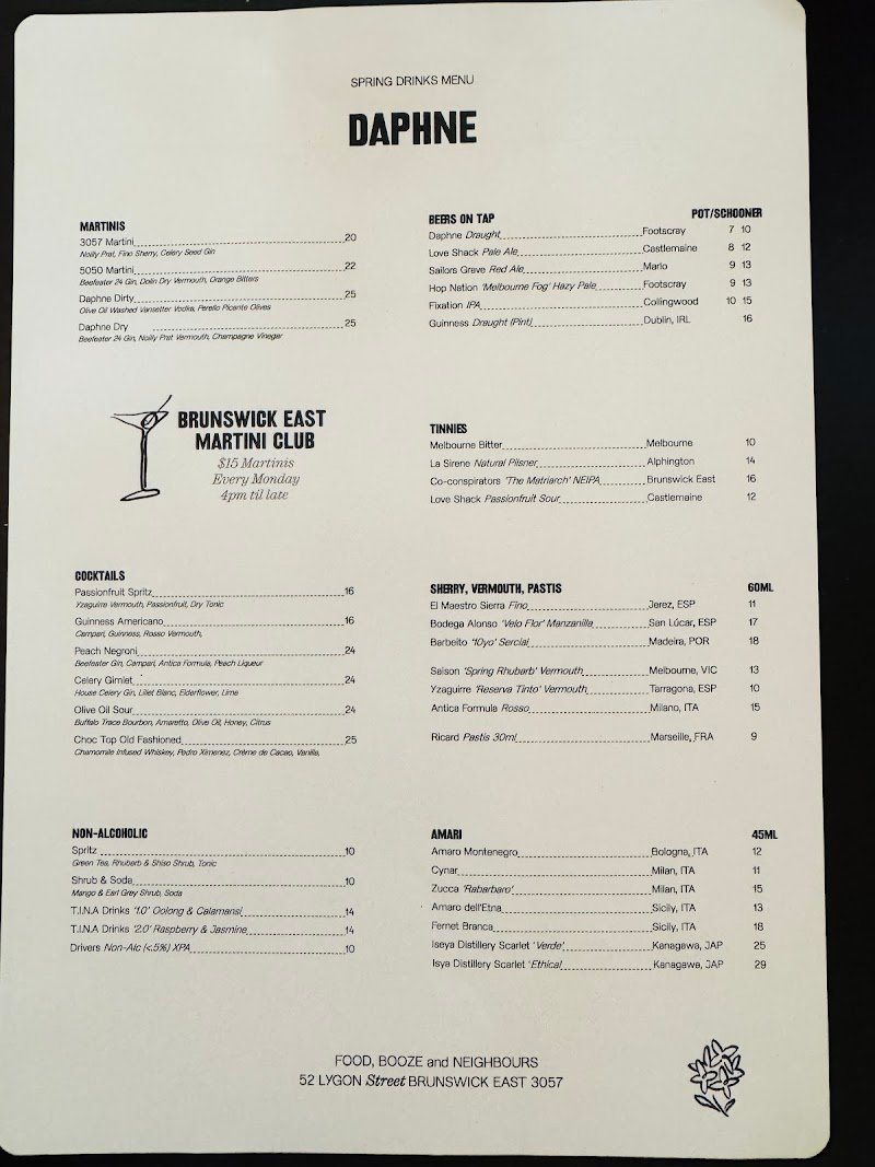 We booked Daphne on a Monday night and the place was absolutely humming โ clearly the spot to be. And although brand new , felt like the team had been doing it forever - Great staff - excellent fit out , amazing food! The flathead cooked over coals was sensational, simple but packed with flavour fresh herbs and picked fennel . The Martini Club is genius โ the 10th one free might just be the best loyalty program in Melbourne. Itโs got that perfect mix of neighbourhood warmth and a bit of sparkle โ everyoneโs friendly, the energyโs great, and it feels like youโve stumbled into somewhere special. Also, can we talk about the open-late-for-supper thing? This is everything a hospo worker dreams of โ somewhere good to eat and unwind after a shift. Hannah just gets it. Absolute legend. Canโt wait to come back!