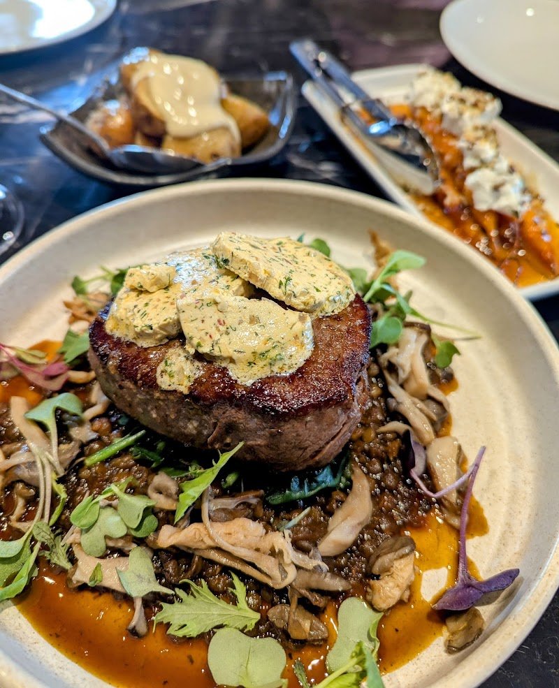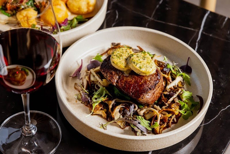 Wonderful food, just outstanding quality. Came here out of convenience, but was blown away. The room is beautiful, the portions are actually quite generous, we could only have some entrees and a main, couldn't fit any room for dessert, so it ends being quite good value. For happy hour, all of the glasses of wine are $9 which is fantastic value. We had the chicken tacos and eye fillet steak which was perfectly cooked. Also had some sides to go alongside. Service was lovely, attentive. The space is quite nice but probably the lighting is quite bright so detracts a little from the otherwise somewhat intimate setting. Perhaps a more lounge type of seating for the bar would be better. The plant wall is spectacular and I saw another couple remark that it appeared fake.