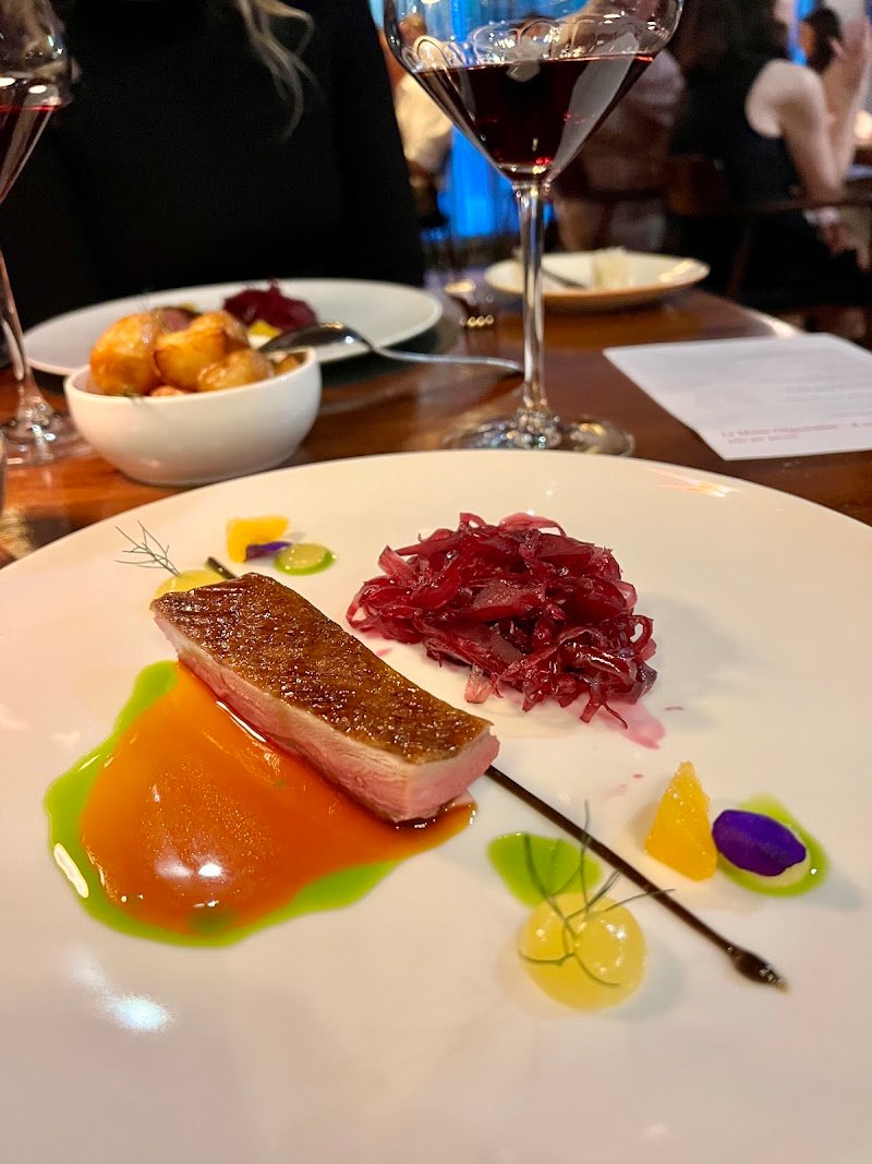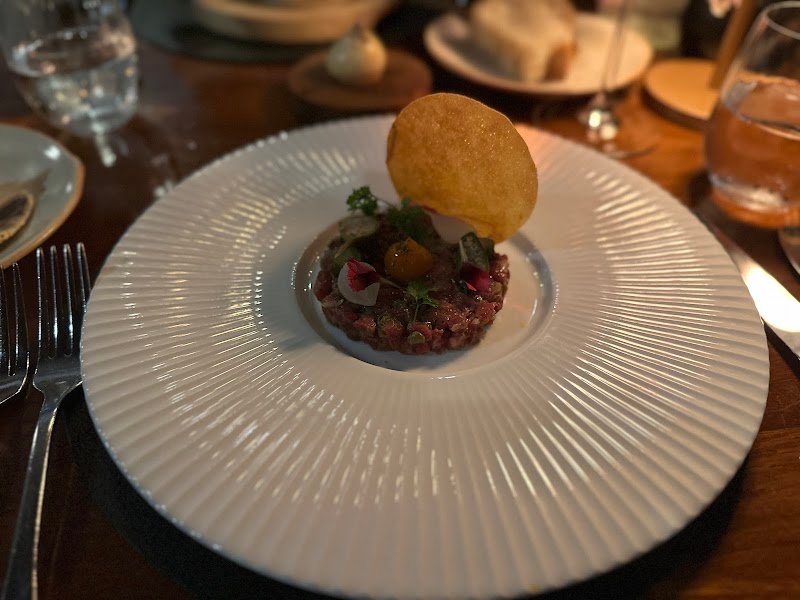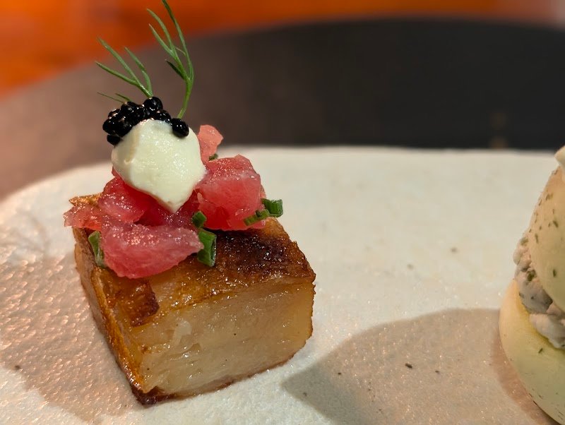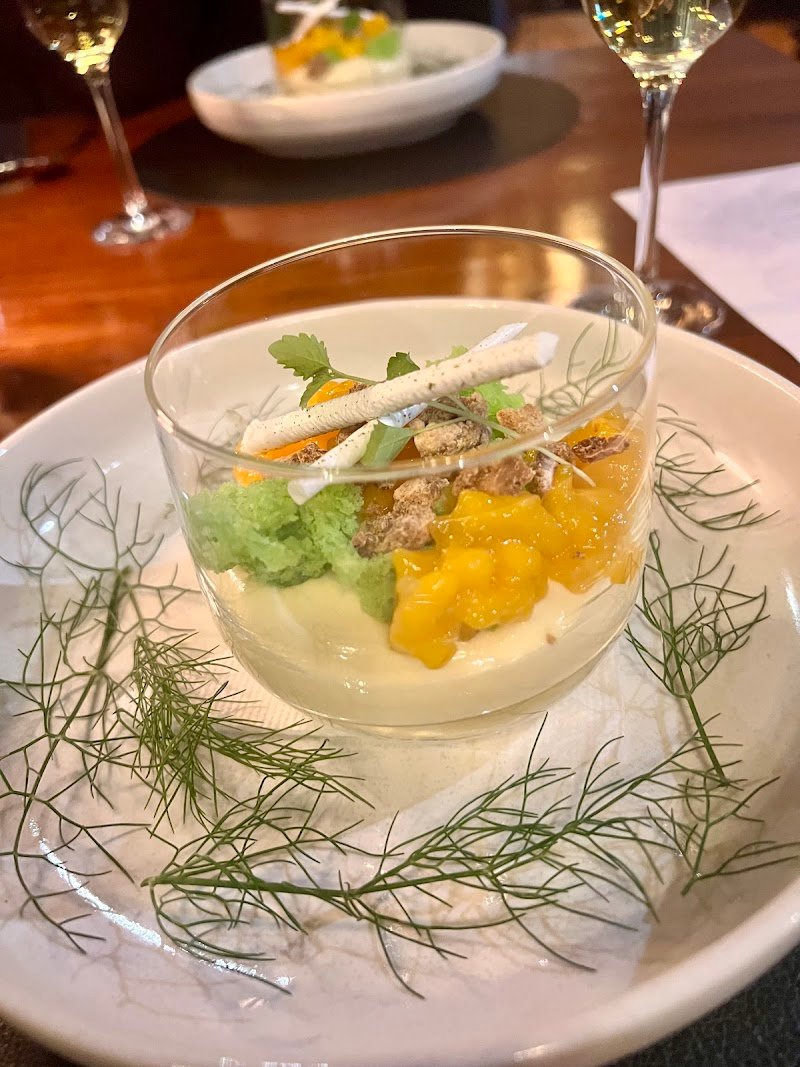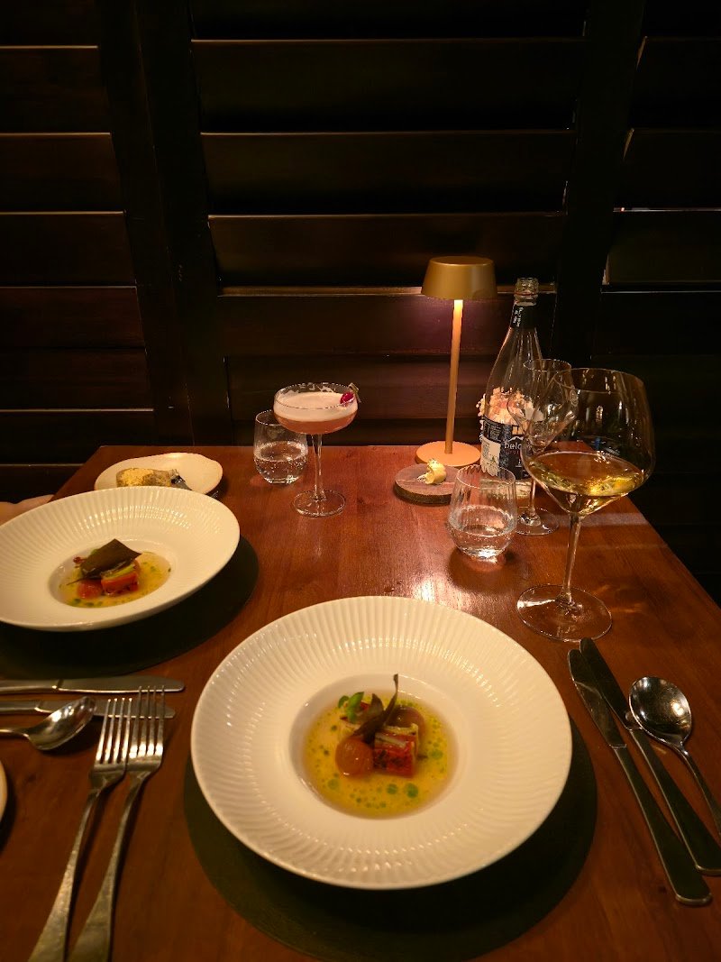 Finally had the chance to try this restaurant that so many people around me have recommended. The service is top-notch and the ambiance is relaxing, though the tables are a bit close together, I could even hear the sound of the fish skin cracker crunching in the mouth of the person next to me. The first dish, a trio combination, was a unique pairing. Each bite delivered a burst of flavor that truly awakened my palate. The second course, corn mousse, was absolutely delightful—creamy and smooth without being heavy, with the sherry vinegar caramel adding the perfect finishing touch. The tuna and tomato salad offered a refreshing cleanse after the mousse, and the generous portion of tuna was truly commendable for a fine dining setting. Beef tartare seems to be on every menu these days, and this version was decent though not particularly standout. The roasted duck, however, was my favorite dish of the evening, perfectly cooked through without becoming tough, with a delicate savory aroma that paired wonderfully with the pickled vegetables. The accompaniments complemented without overwhelming the duck’s natural flavor. The 30-month-aged Comté cheese needs no explanation, I finished it in two bites and still wanted more. If you haven’t yet experienced this hidden gem of fine dining, I urge you to visit soon. And as a colada enthusiast, I must say their Banana Colada was also a highlight for me.